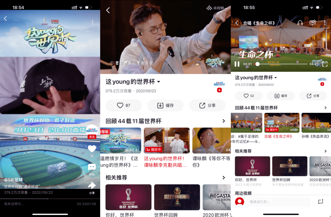 早在9月23日,央视频就携手总台解说天团以及谭咏麟、李克勤等明星大咖制作了预热综艺《这young的世界杯》,节目里众明星回顾44载11届世界杯记忆并动情献唱之余,还顺便带货了米卢签名帽、梅西签名球衣等“世界杯好物”。