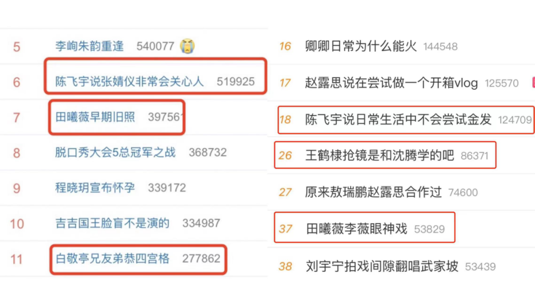 小生里,前有王鹤棣、吴磊,现有陈飞宇、白敬亭,名字每天挂在热搜上,甚至有同时段不下于10条的时候。小花的竞争则集中在95花赵露思、虞书欣、张婧仪、田曦薇,每天都在比美斗艳。