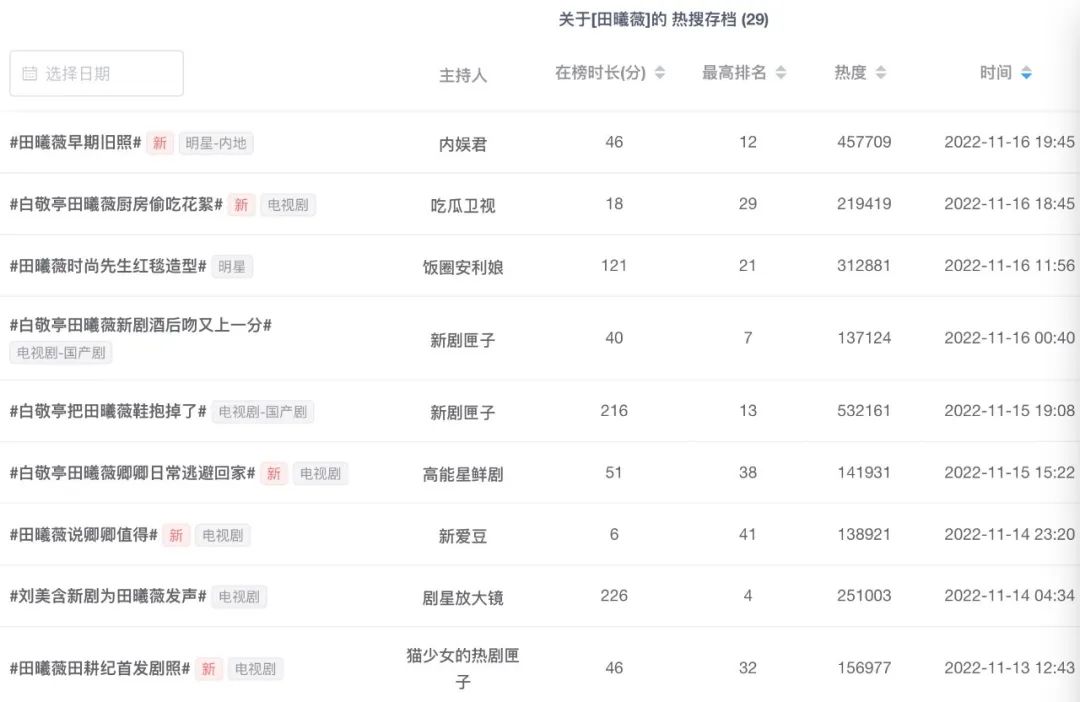 白敬亭在《开端》播出的今年1月有65个热搜,目前11月刚播出《卿卿日常》的热搜已达35个。按这个发展趋势,应该会超过《开端》时期的热搜数。而《卿卿日常》女主角田曦薇也在发力营销,剧集播出前才8个热搜,剧集播出后一股脑上了21个热搜。