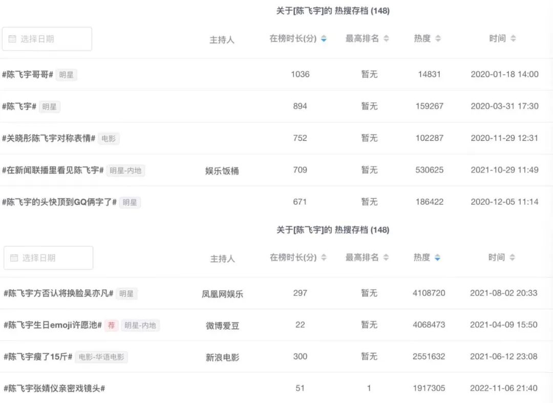 根据热搜搜索引擎数据,陈飞宇在榜时间最长的热搜话题是2020年上榜的#陈飞宇哥哥#,热度最高的话题是2021年上榜的#陈飞宇方否认将换脸吴亦凡#;