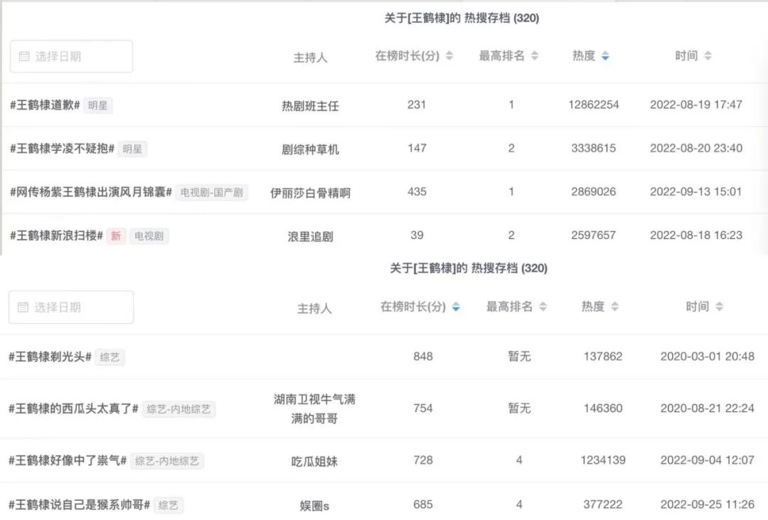 王鹤棣在榜时间最长的热搜话题是2020年的#王鹤棣剃光头#,热度最高的话题是关于今年的核酸插队事件#王鹤棣道歉#;