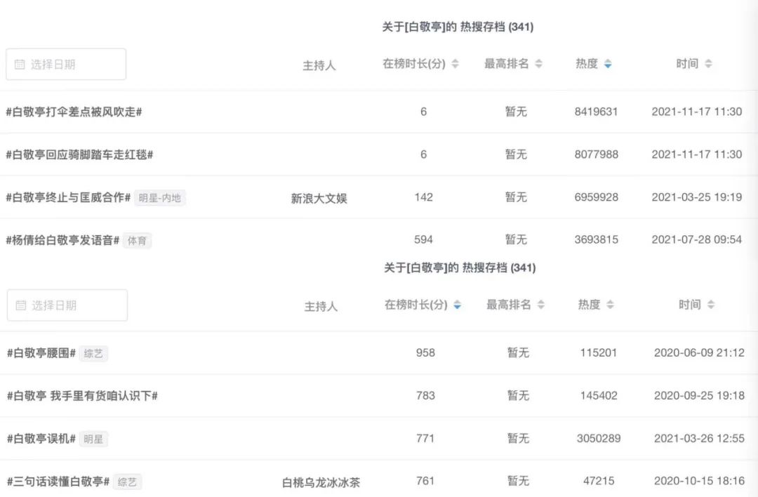 而白敬亭在榜时间最长的热搜话题是2020年综艺上量腰围事件#白敬亭腰围#,热度最高的话题竟然还是2021年GQ红毯推出的多tag话题#白敬亭打伞差点被风吹走#。