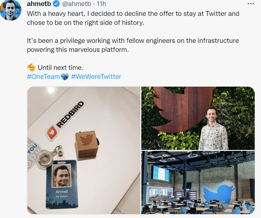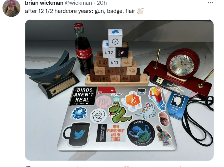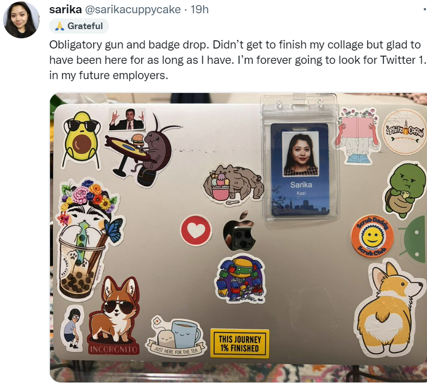 这些感言并不长,毕竟 Twitter 还是一个280字的社交平台。更多人发了自己的工卡和笔记本电脑的照片,配上一小段话。