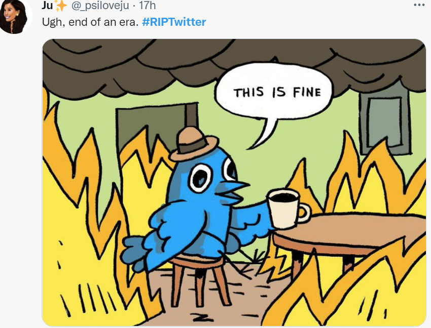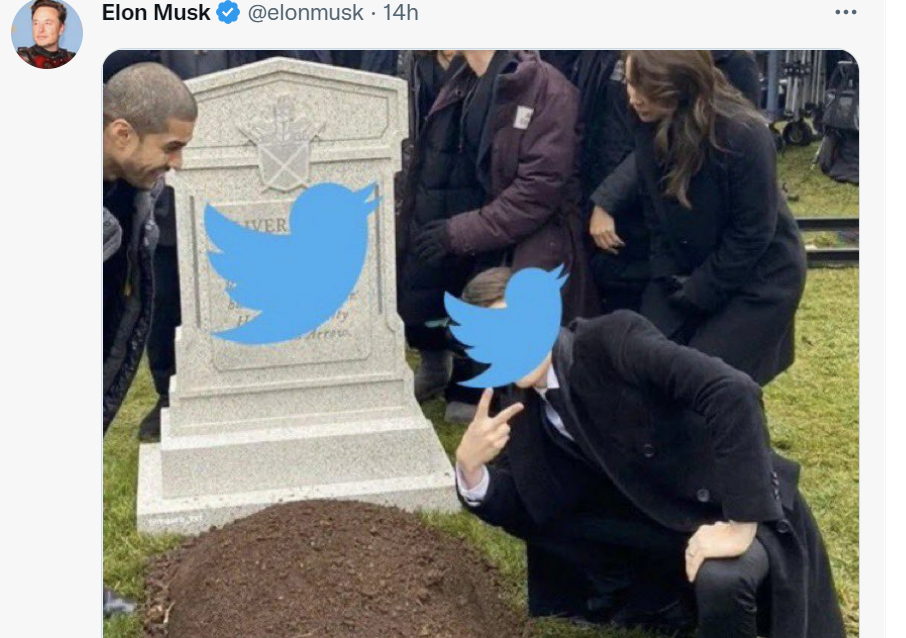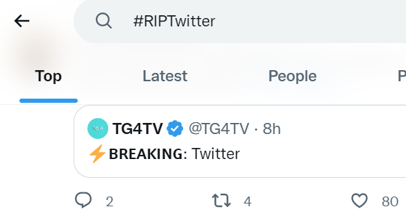 随着越来越来越多的Twitter员工宣布自己的离开,不少网友意识到,这事儿可能要闹大了。不少人开玩笑说在这一轮之后 Twitter 就要彻底完蛋了,调侃、笑话和梗图源源不绝冒出来。所以在当晚,#RIPTwitter 这个搞笑话题,一度霸占了 Twitter 热搜榜第一名。
