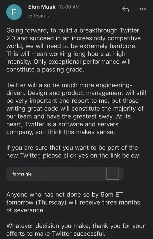也即,这些仅存的 Twitter 员工,只有不到一天半的时间,来考虑到底要不要跟着这个不靠谱的新首富老板,同他一起踏上一场“硬核”的重新创业之旅。