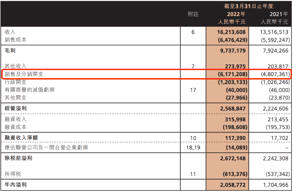 财报显示,2021-2022财年,由于对品牌羽绒服业务渠道建设、终端门店建设,以及品牌宣传营销力度加大等原因,波司登分销开支(含广告和宣传费用、使用权资产折旧费、或有租金以及销售雇员开支)已经成为集团最大支出,同比增加28.4%达到61.71亿元,占集团总营收的38.1%。