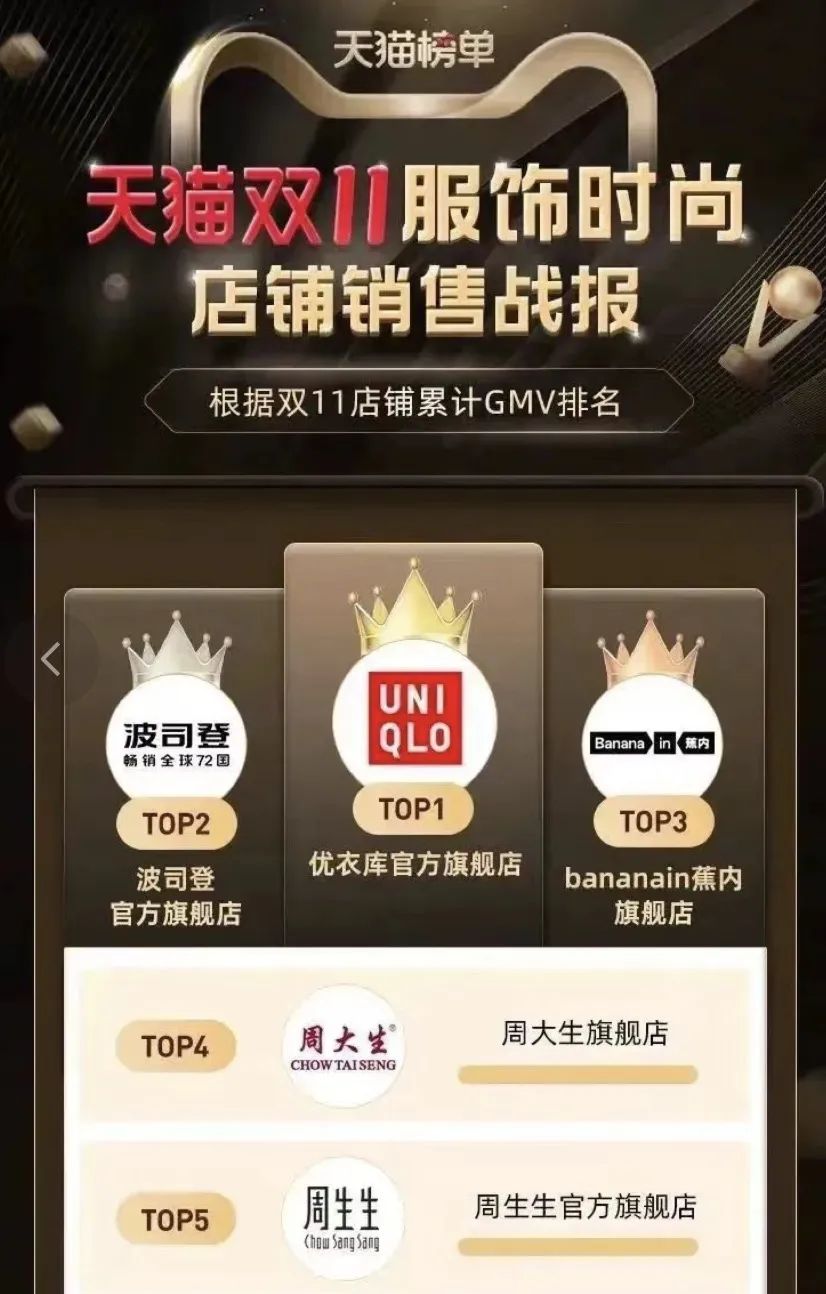 天猫双11服饰时尚店铺销售榜单(图片来源:天下网商)