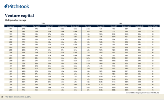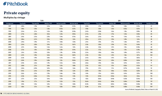 我拿到的另一份数据也能佐证这一规律。根据PitchBook编写的2022Q1Benchmark,如果比较同一年份的VC和PE,2015年之前成立的PE市场中位数的DPI均超过1,VC则不一定。