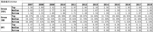 我拿到一份Benchmark,基于投中研究院对国内700到800只人民币基金的调研,上图为部分数据。根据截至2020Q4的数据,每只基金按照TVPI、IRR和DPI三个维度从高到低排序,Top代表上四分位,Median代表中四分位,Bottom代表下四分位。