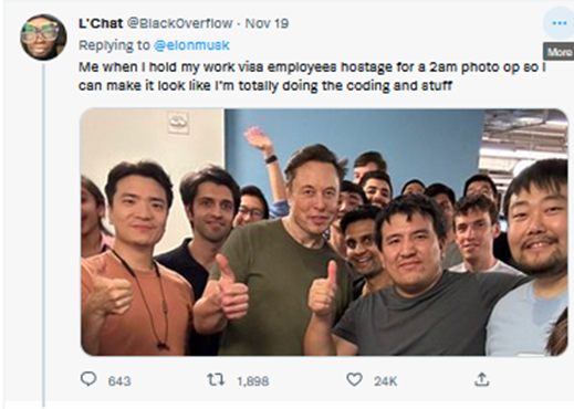 即便是那些选择留下的人,不少人也怀疑他们是否心甘情愿。在马斯克发布凌晨1点半的加班合照之后,有人发现图片里的亚裔和印度裔员工占比很大,继而发出嘲讽:看起来都是受困于工作签证的可怜人。