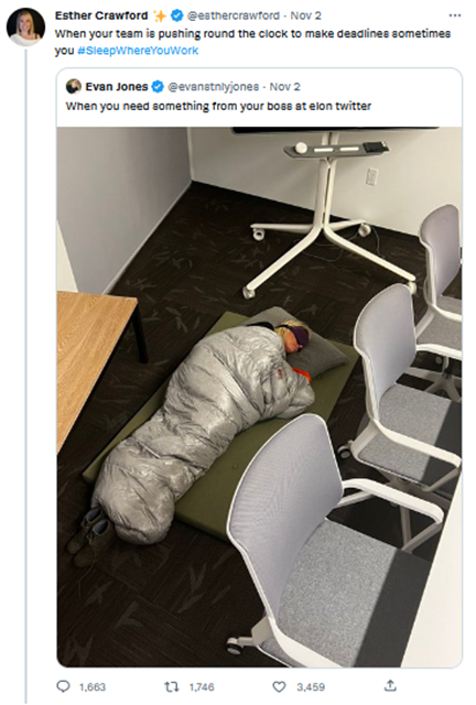 在推特大裁员之前,有一张照片疯传社交网络。照片中,一位员工睡在办公室的地板上,明显是在加班加点忙活着什么。