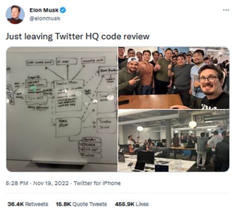 虽然这个举措让不少员工选择了辞职,但这似乎没有影响马斯克推行“狼性”职场文化。当地事件11月19日凌晨1点半,马斯克发推特表示“结束代码审查,正准备离开公司”,附带着与数十名员工的合影。