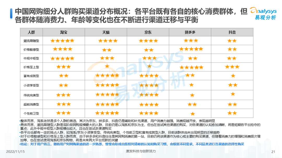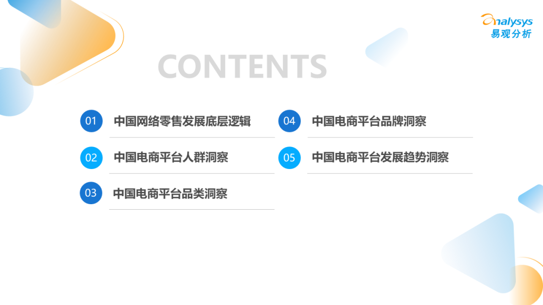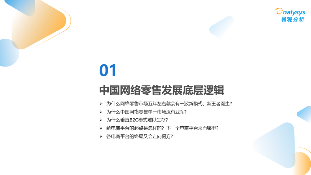 本分析内容主要分析了中国电商平台的发展历程、成就平台的起点与终点、新平台诞生的可能性、平台演绎的底层逻辑,以及各电商平台的人群特征、品类特征、品牌特征、平台机制等发展现状及趋势。具体问题包括: