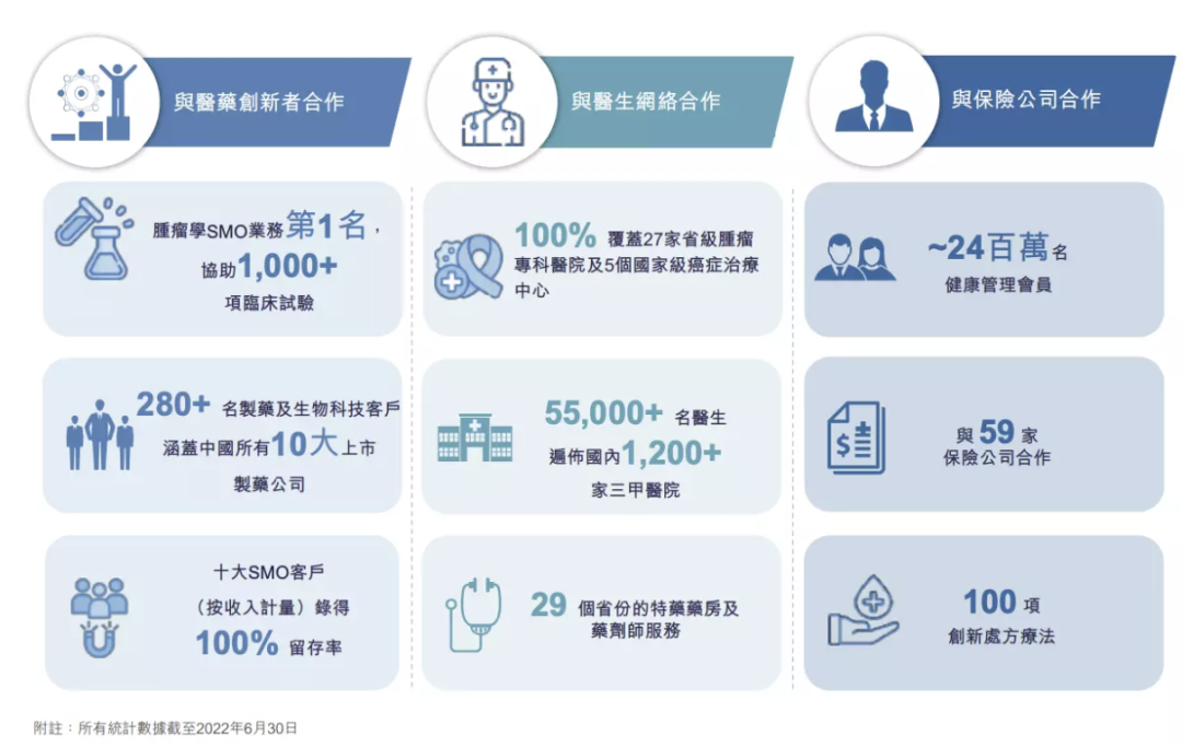 2017年左右,思派健康将业务发展的重心从医生研究解决方案侧转移到药品福利管理侧。招股书显示,按2021年的收入计算,思派健康的特药药房业务经营着中国最大的私营特药药房,医生研究协助经营着最大的肿瘤临床试验现场管理组织(SMO);截至2022年6月,思派健康已经有103家特药药房,完成99个SMO项目;2019年,思派健康开始大力推动保险业务,与保险公司合作推出首个保险计划惠民保,已经收获了约1420万个人会员。