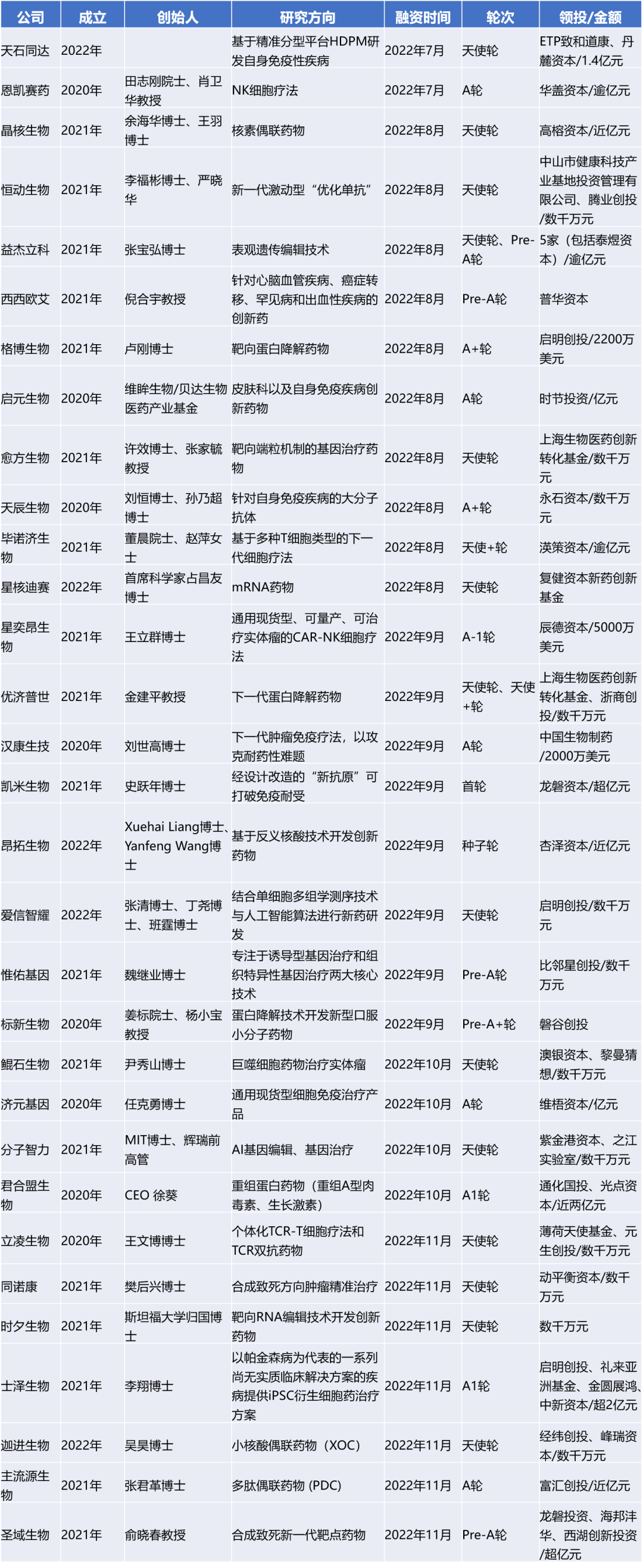 2020年以来成立的主要Biotech,今年下半年融资情况