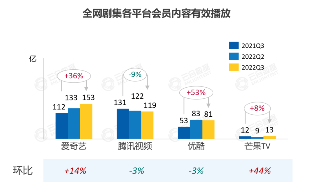 但真正致命的打击,来自于腾讯视频的内容生态。云合数据显示,会员内容侧,爱优芒会员内容有效播放同比均为正增长,只有腾讯视频,会员内容有效播放同比及环比分别下降9%、3%。