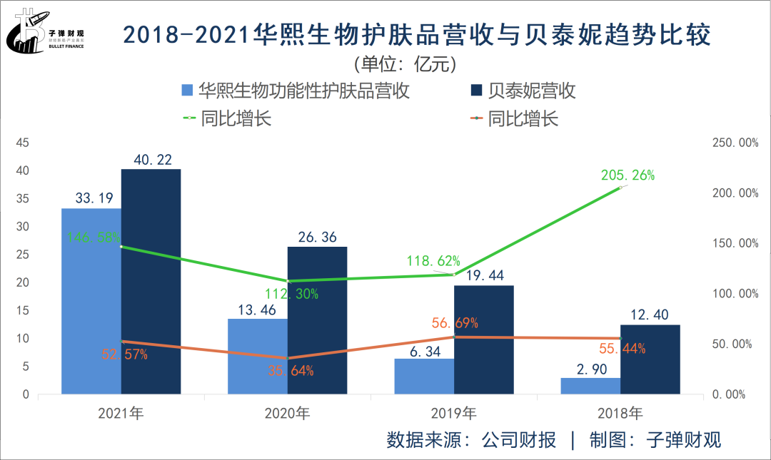 2018-2021年,华熙生物护肤品业务增速一直保持在100%以上,而贝泰妮则稳定在50%左右。