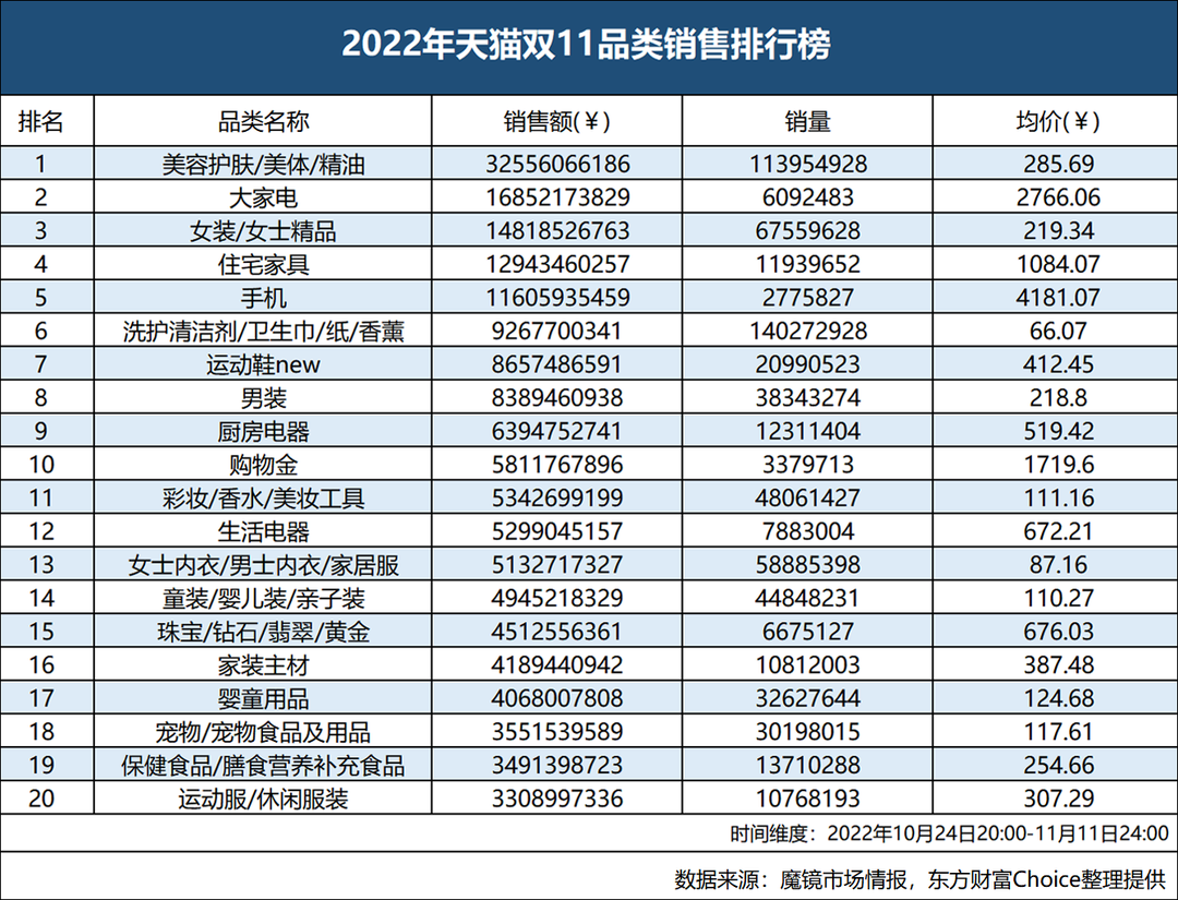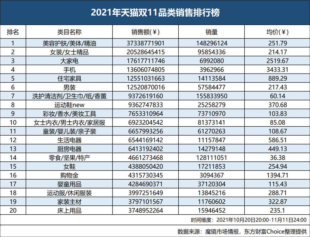 根据魔镜市场情报数据(东方财富Choice整理提供),今年天猫双11销售额第一大品类依然是美容护肤,从销售额和销售量来看,分别同比下降了12.8%和23.2%。