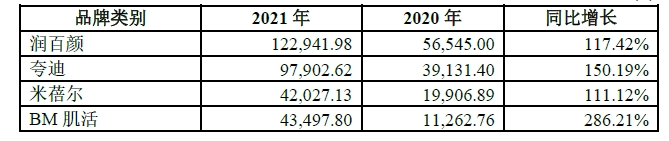 与贝泰妮主要营收都来自薇诺娜品牌不同,华熙生物的护肤品业务是典型的多品牌布局,核心四大品牌润百颜、米蓓尔、夸迪、BM肌活,分别围绕玻尿酸科技护肤、敏感肌、抗衰、量肤定制等进行差异化定位。