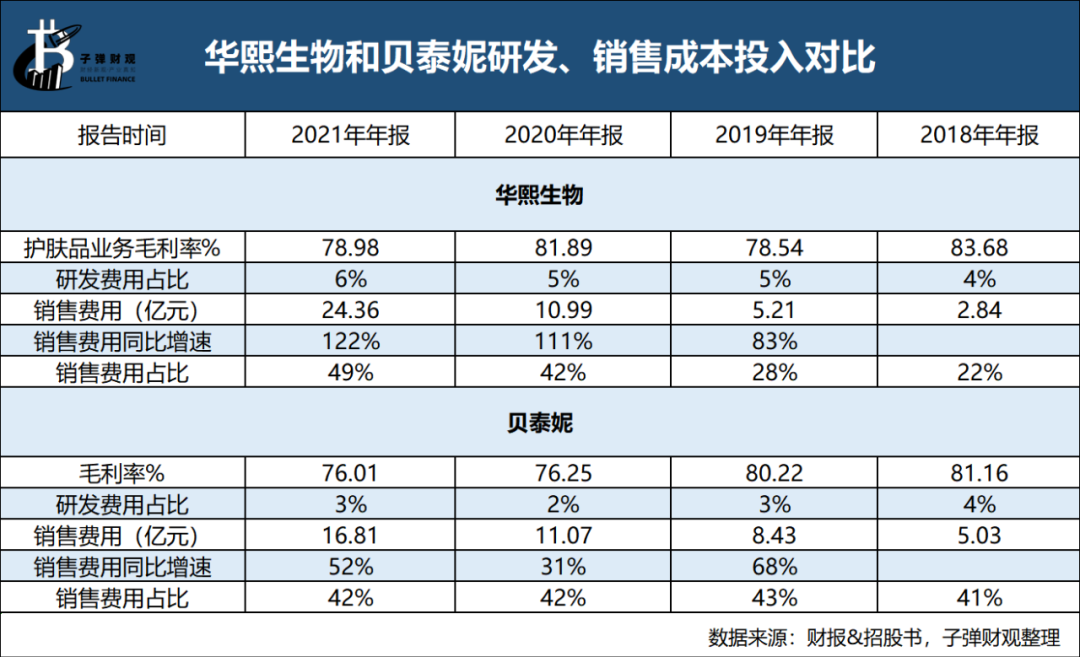 营收和增速只是一方面。虽然华熙生物和贝泰妮毛利润都维持在80%左右,整体区别不大,但在研发、营销投入上,二者差别明显。
