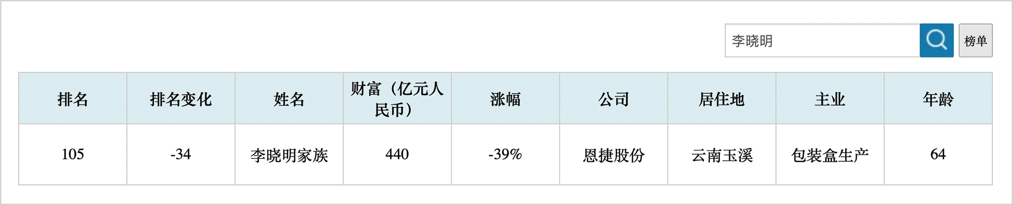 在2021年度胡润百富榜中,李晓明家族的身价达到725亿元,是该榜单TOP100中唯一的云南富豪。