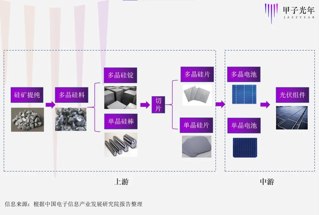 一个晶硅光伏组件的诞生,要经历硅料、硅片、电池片以及组件封装四步:先将硅矿提纯为多晶硅料,再进行铸锭或拉晶,切片,产生多晶/单晶硅片,然后结合磷、硼等辅材,改变硅片的物理结构,使之可以发电,形成电池片,最后将电池片串联,添加玻璃、盖板进行封装,即最终的组件产品。