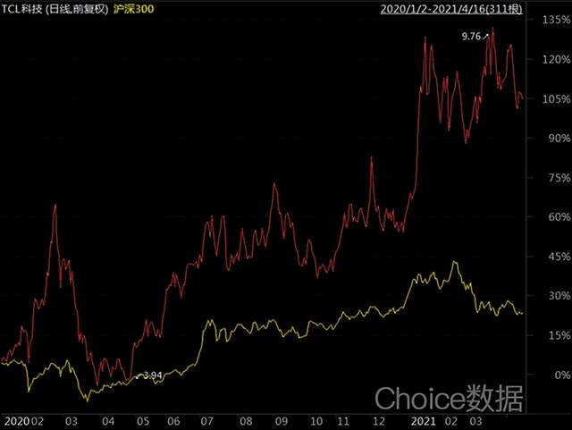 在14个月时间内,TCL科技股价最高站上了9.76元,市值冲至1369亿。