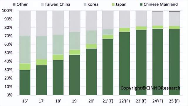 图:2016-2025年全球面板产能区域占比趋势预测,来源:CINNO Research