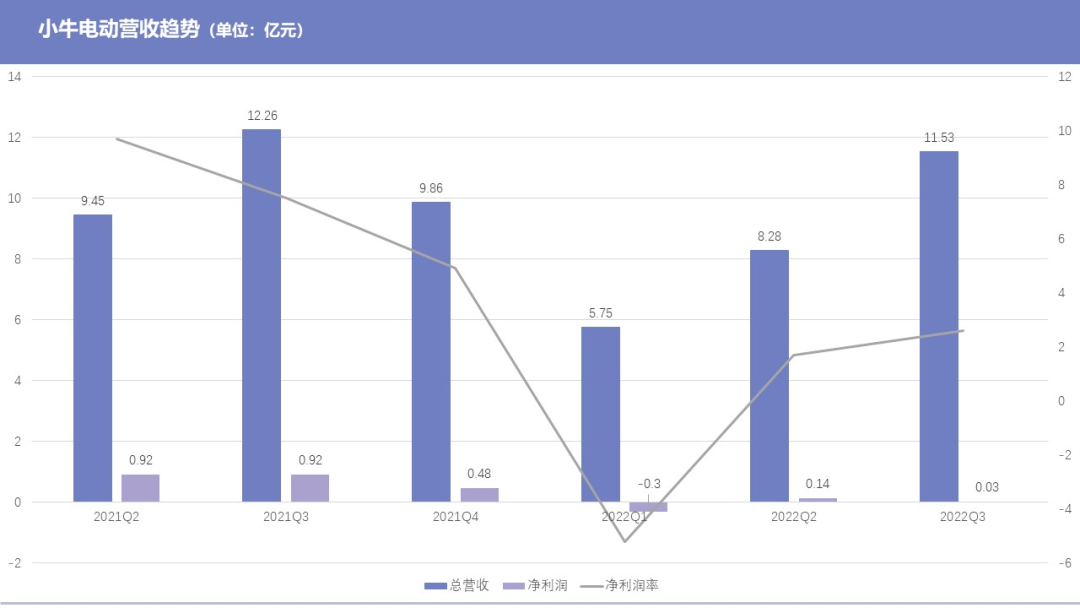 根据小牛电动最新发布的截至9月30日的2022年第三季度财报显示,小牛电动当季营收11.532亿元,较上年同期下滑6.0%。净利润290万元,上年同期净利润为9170万元。