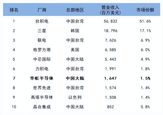 在特色工艺领域发展近二十年,华虹勉强挤进了行业前十。根据Trend Force发布的2021年度全球晶圆代工企业的营业收入排名数据,华虹半导体位居第七位;在大陆地区,华虹的营收仅次于中芯国际。