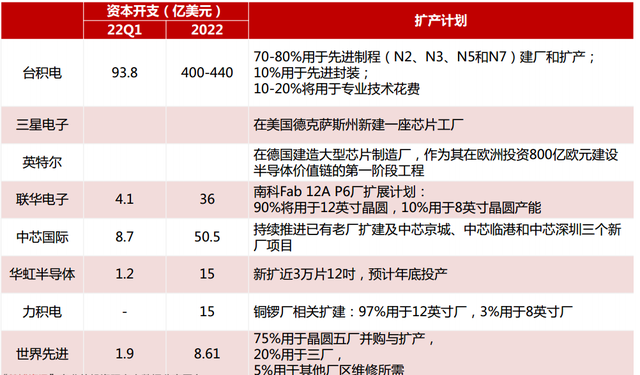 图7:2022年主要晶圆代工厂扩产计划,资料来源:各公司官网,方正证券