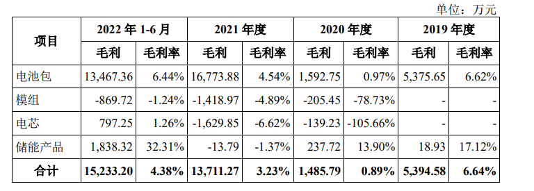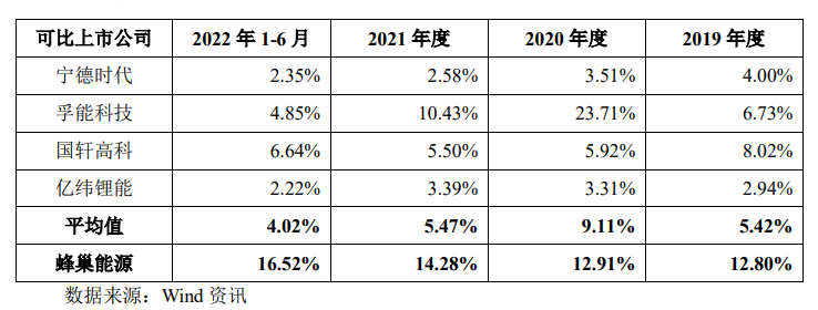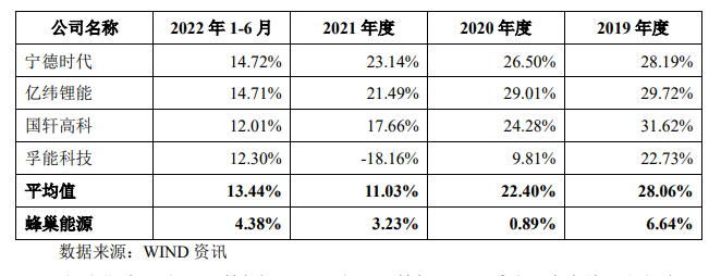2019年-2022上半年,蜂巢能源的主营业务毛利率分别为6.64%、0.89%、3.23%和4.38%,而招股书选取的可比公司(宁德时代、亿纬锂能、国轩高科、孚能科技)同期毛利率平均值为28.06%、22.40%、11.03%和13.44%。