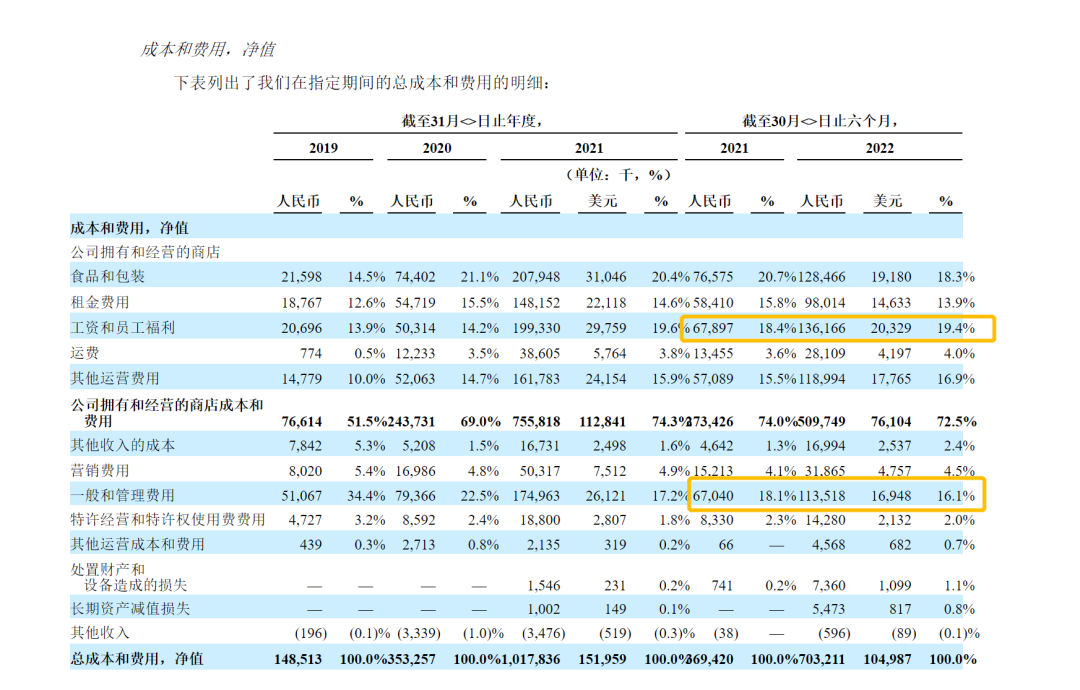 截至2022年6月,Tims中国仅有440家店,是瑞幸的十七分之一,但2021年的总运营成本达到了7亿元,占瑞幸的五分之一。其中租金0.98亿元、食品和包装1.28亿、营销成本0.32亿元,占总成本的比例,都比瑞幸更低,但成本中的员工工资和福利,以及费用中的一般和行政费用,却一骑绝尘,合计占比超过35%,而瑞幸的此项,仅占11%。