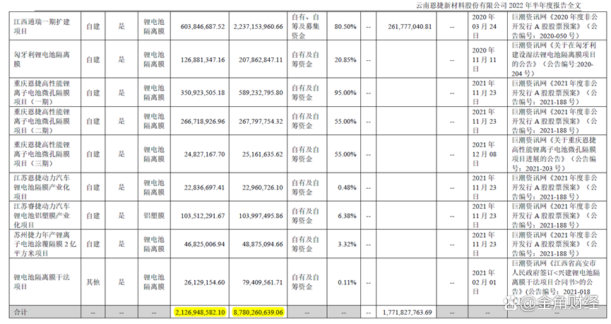 值得注意的是,恩捷股份目前尚有大量项目在建。这些未完工的项目中,今年上半年产生的投资额就高达21.27亿,且已累计投入了87.8亿。