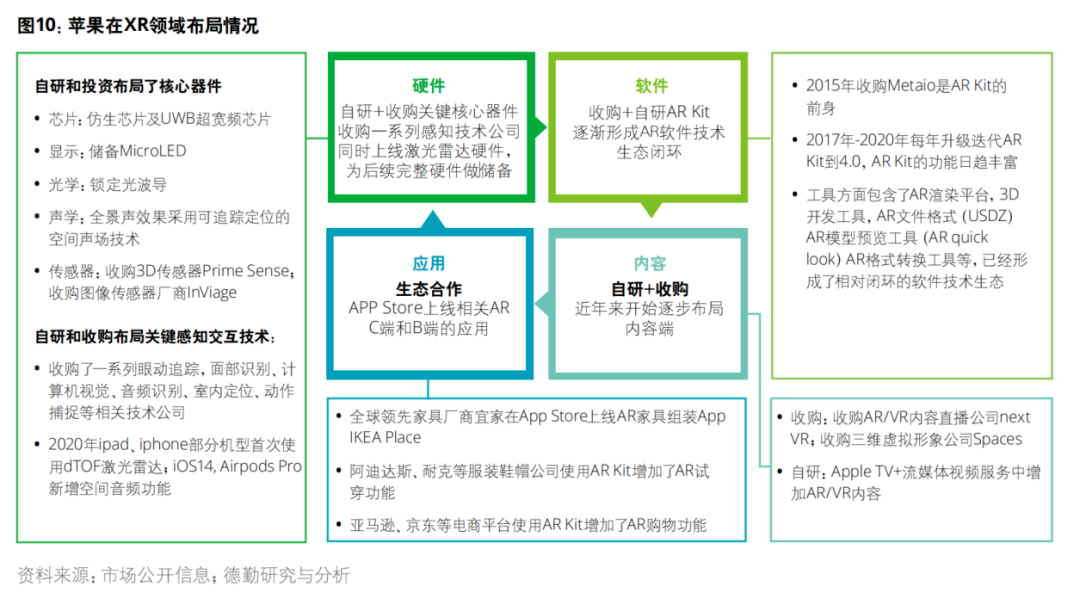 比如苹果,虽然它的AR眼镜像是开出的一张空头支票,但过去多年,凭借着自研和投资并购,其已经建立起了在硬件、软件、应用、内容上的基础生态。