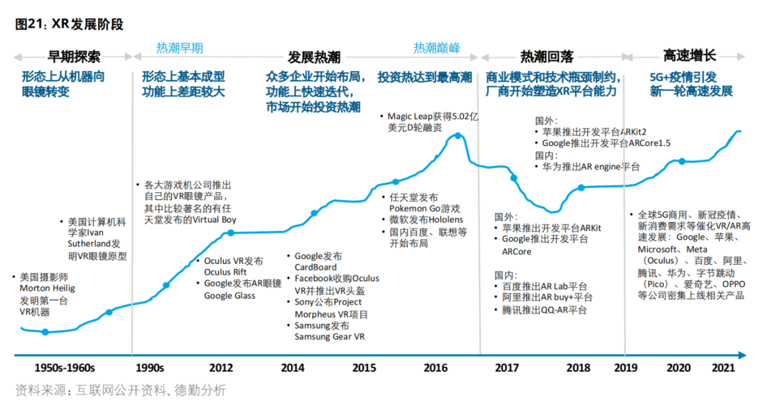 直到2019年以后,叠加5G的普及、上游产业链芯片等核心配件的技术进步、疫情对线上化的催化作用,再加上去年元宇宙的概念推动等多重因素,XR行业快速复苏,并且多了很多巨头的身影。