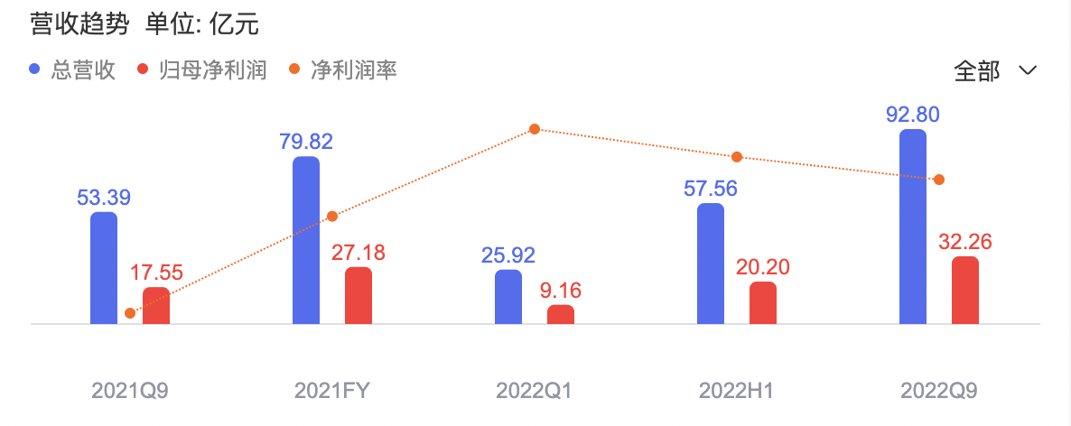 2022年三季报显示,今年前三季度恩捷股份实现营收92.80亿元,同比增长73.81%;归母净利润32.26亿元,同比增长83.77%。