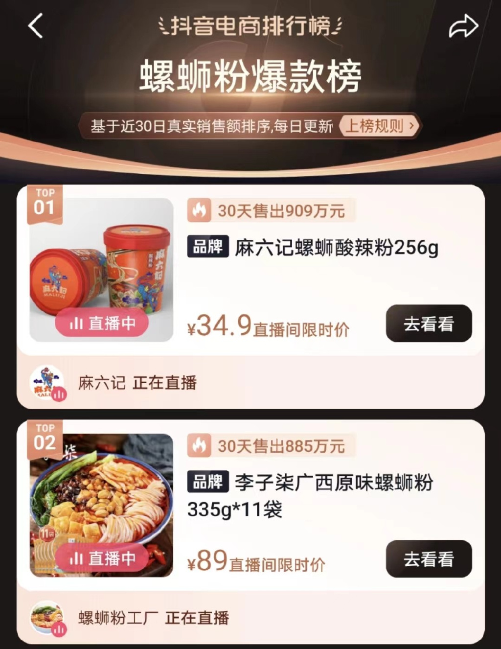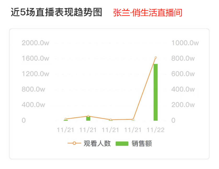 “发疯”之前,其总场观看人数 60 万左右。飞瓜数据显示,11月22、23日当天,观看人次达到了1632万、 2702万,粉丝量4天内飙升200多万。仅23日一天,张兰直播间的销量超过25万、销售额超过1000万,单日销售额翻了几十倍,而最火的酸辣粉售价39.9元一份,售出164万余份,以此计算累计GMV已经超过6700万。