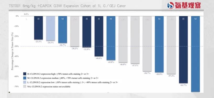 这一优势让TST001具备覆盖Claudin18.2中表达患者的可能。如下图所示,根据今年9月创胜集团在ESMO公布的临床数据,TST001针对中表达患者效果同样突出。