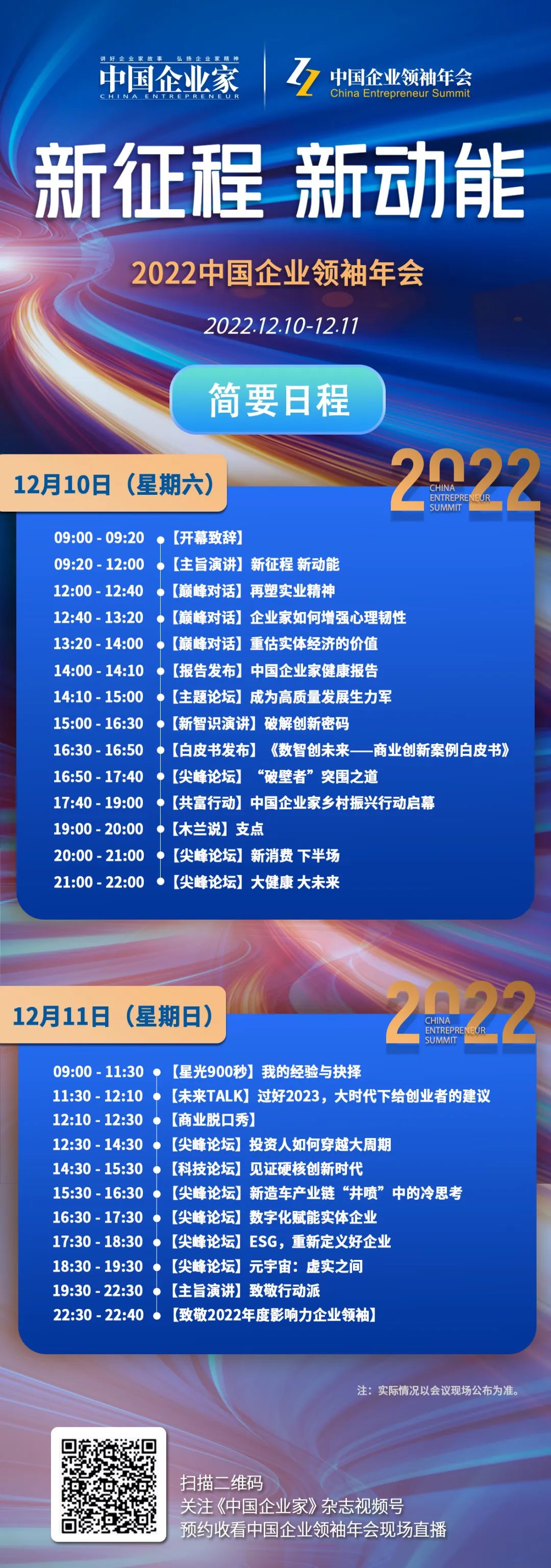 本次年度主题是“新征程 新动能”。2022年国际国内宏观环境都出现了超预期变化,各种不确定性叠加,大变局时代,企业家何为?中国共产党第二十次全国代表大会已胜利闭幕,当前新图景已经清晰,新征途即将开启。