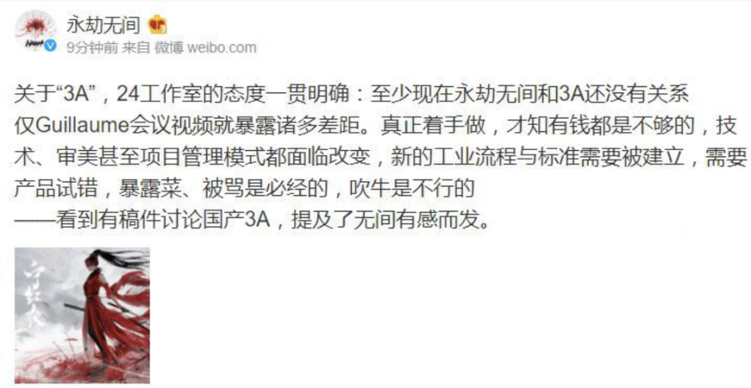 去年的《永劫无间》在国内探索了买断制的市场接纳程度并打破销量纪录,其制作组曾数次明确表态“《永劫无间》和3A没有关系”,技术、审美、项目管理还有“诸多差距”。而官博的另一条推文则写道:“今日国产3A若功成,必不在永劫无间;明日国产3A之成功,必将有24的努力。”