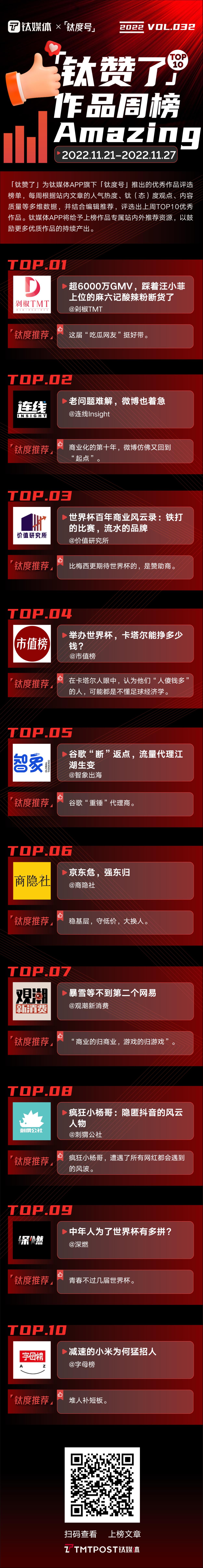 2022年11月21日—11月27日,「钛赞了」榜单第32期上榜作品为: