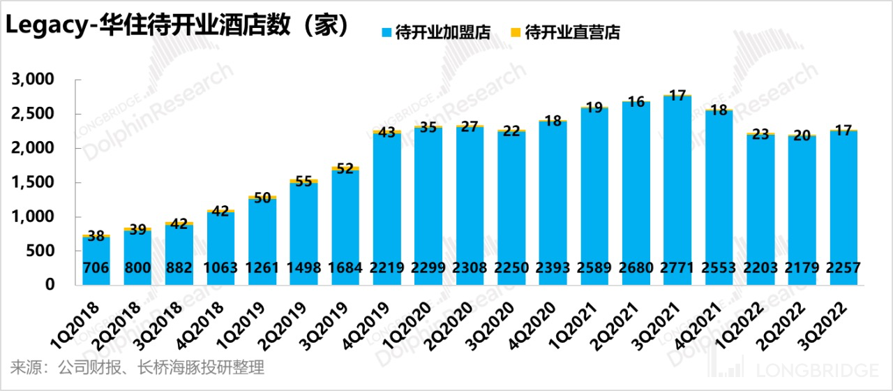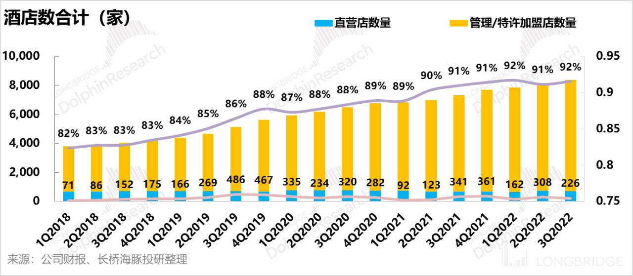 2022 年单第三季度净开酒店 226 家,Pipeline(储备门店)达 2274 家,其中自营酒店 17 家,加盟酒店 2257 家,加盟模式占比达到 99.25%,有助于集团未来整体加盟店占比进一步提升。海豚君认为华住作为行业龙头,虽然在疫情反复的背景下拓店受到一定影响,但公司有在加速收缩软品牌门店,持续优化门店的质量,稳步扩张。长远来看,公司品牌力强,运营效率高,这个是未来业绩稳定增长的基础。