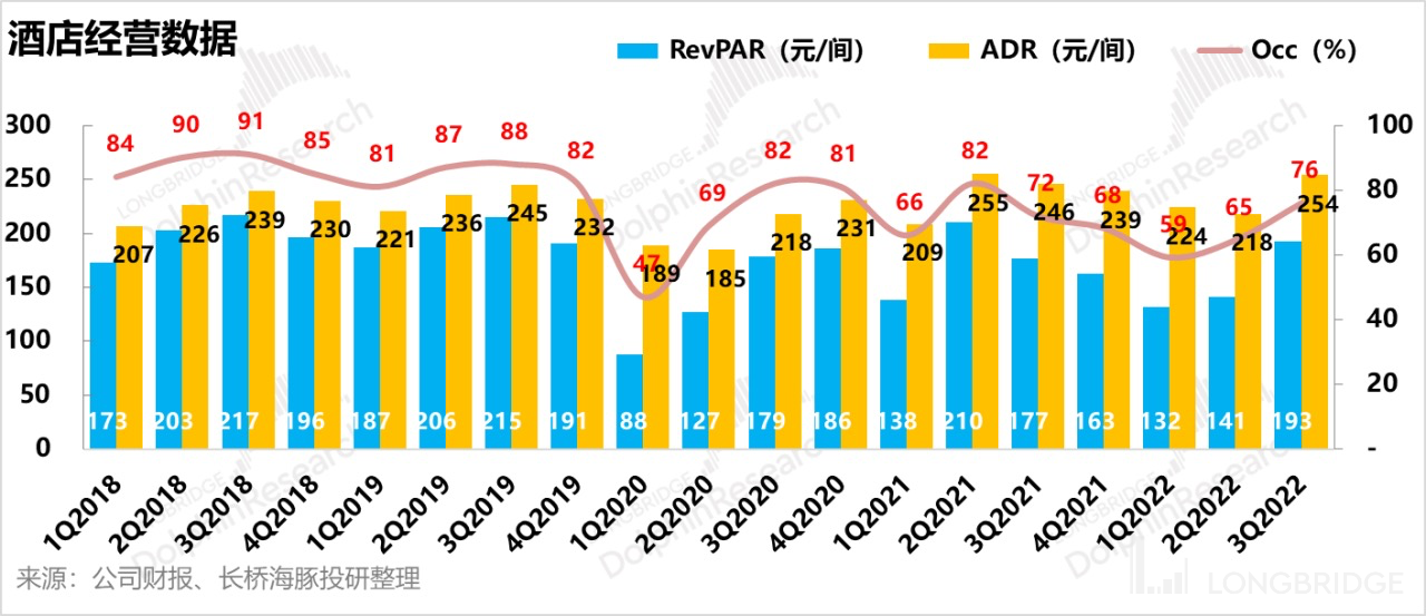Legacy-Huazhu 部分,2022 年三季度,ADR 为人民币 254 元,比 2021 年第三季度 246 元增长 3.25%;与疫情前 2019 年第三季度 245 元相比较增长 3.67%。