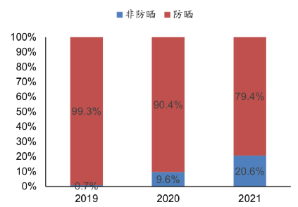 蕉下防晒与非防晒SKU占总营收比例,来源:招股说明书、华创证券