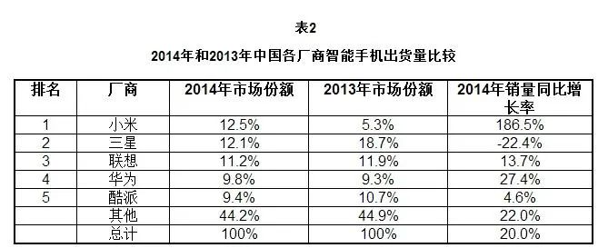 彼时,中国智能手机市场的竞争已经日趋白热化,以小米为代表的互联网智能手机厂商,已颠覆了此前中国智能手机行业的“中华酷联”格局。IDC数据显示,2014年,小米智能手机市场份额为12.5%,位居中国市场第一,同比增长186.5%。