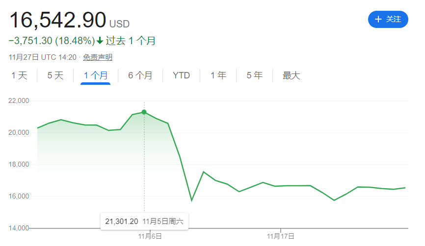 以有着“虚拟黄金”之称的比特币为例,截止11月27日,比特币报价16522.9美元/枚,虽然较此前数日略有回升,但相较于11月2日FTX被媒体曝出存在债务问题后还高达21301.2美元/枚的价格,如今已经跌去近5000美元,下跌超过23%。