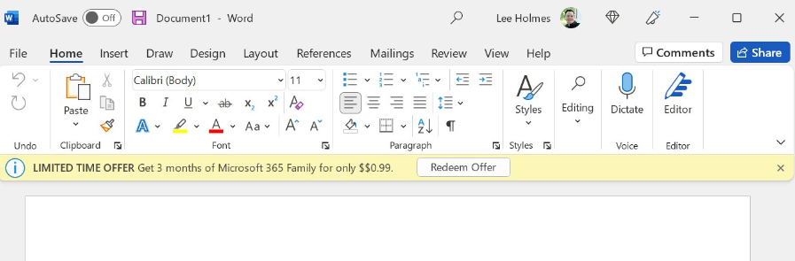比如在去年8月,微软就在 Office 2021 版本的 Word 工具栏下方,用极其明显的方式展示 Microsoft 365 订阅服务打折的广告: