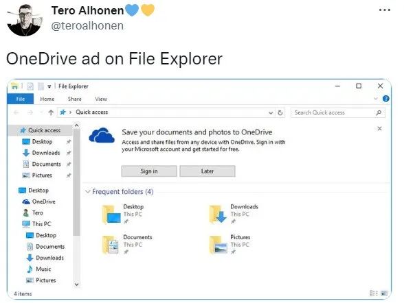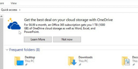 而实际上,从2016年开始,微软就已经在文件资源管理器 (File Explorer)——最顶级和核心的系统级功能里,加入巨大的顶栏广告了……