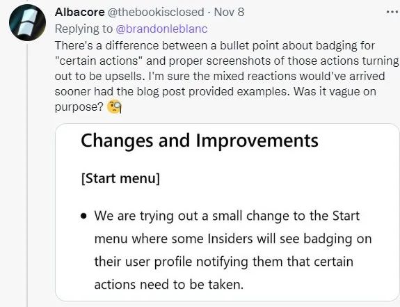微软方面也对此做出了回应。负责 Insider 项目的高级项目经理 Brandon LeBlanc 表示,微软之前在本轮 Insider 版本更新文档里面已经预告过,将会在开始菜单的部分位置增加一些“新设定了”。